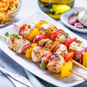 Préparer les brochettes en intercalant poulet et légumes, badigeonner avec la marinade.