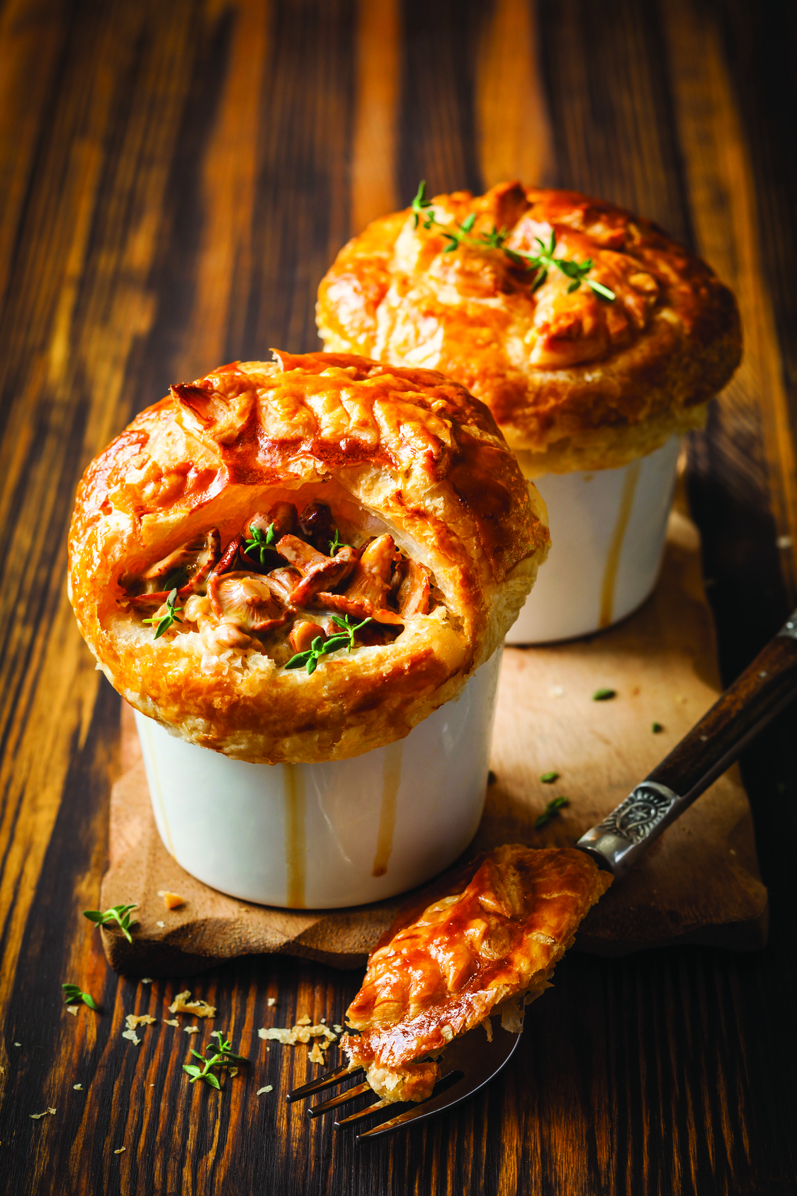 Répartir les champignons dans les ramequins, recouvrir de pâte feuilletée, bien appuyer sur les bords pour les sceller aux ramequins.