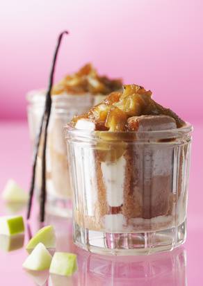 Mettre un peu de fromage blanc, des pommes, de nouveau du fromage, terminer pas des pommes.