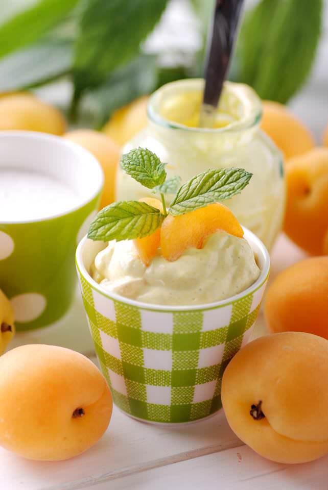 Répartir les abricots dans des petits pots, recouvrir de crème, décorer de morceaux d'abricots. réserver au frais jusqu'au moment de servir.
