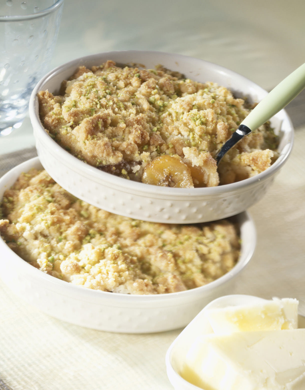 Parsemez le crumble sur les prunes, ajouter un peu de pistaches et cuire au four pendant 30 minutes environ.