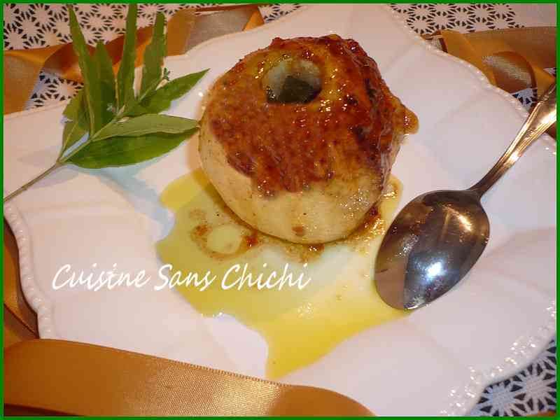 Les placer dans un plat, versez au centre de chaque pomme et sur le dessus une cuillère à café de miel, le beurre, saupoudrer de cannelle et la feuille de verveine.