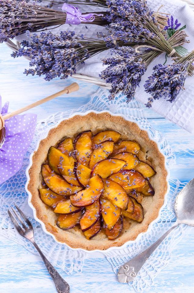 Répartir sur le fond de tarte, arroser de filets de miel liquide, parsemer de fleurs de lavande, enfourner 15 min environ.
