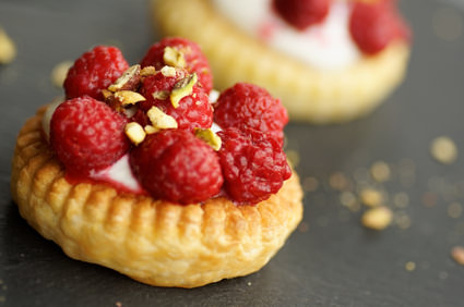Répartir la crème sur les fonds de tartes, puis les framboises, parsemer de pistaches.
