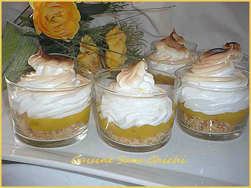 Mettez les verrines dans le plat du four, passez les verrines sous le gril juste le temps de colorer le dessus de la meringue.