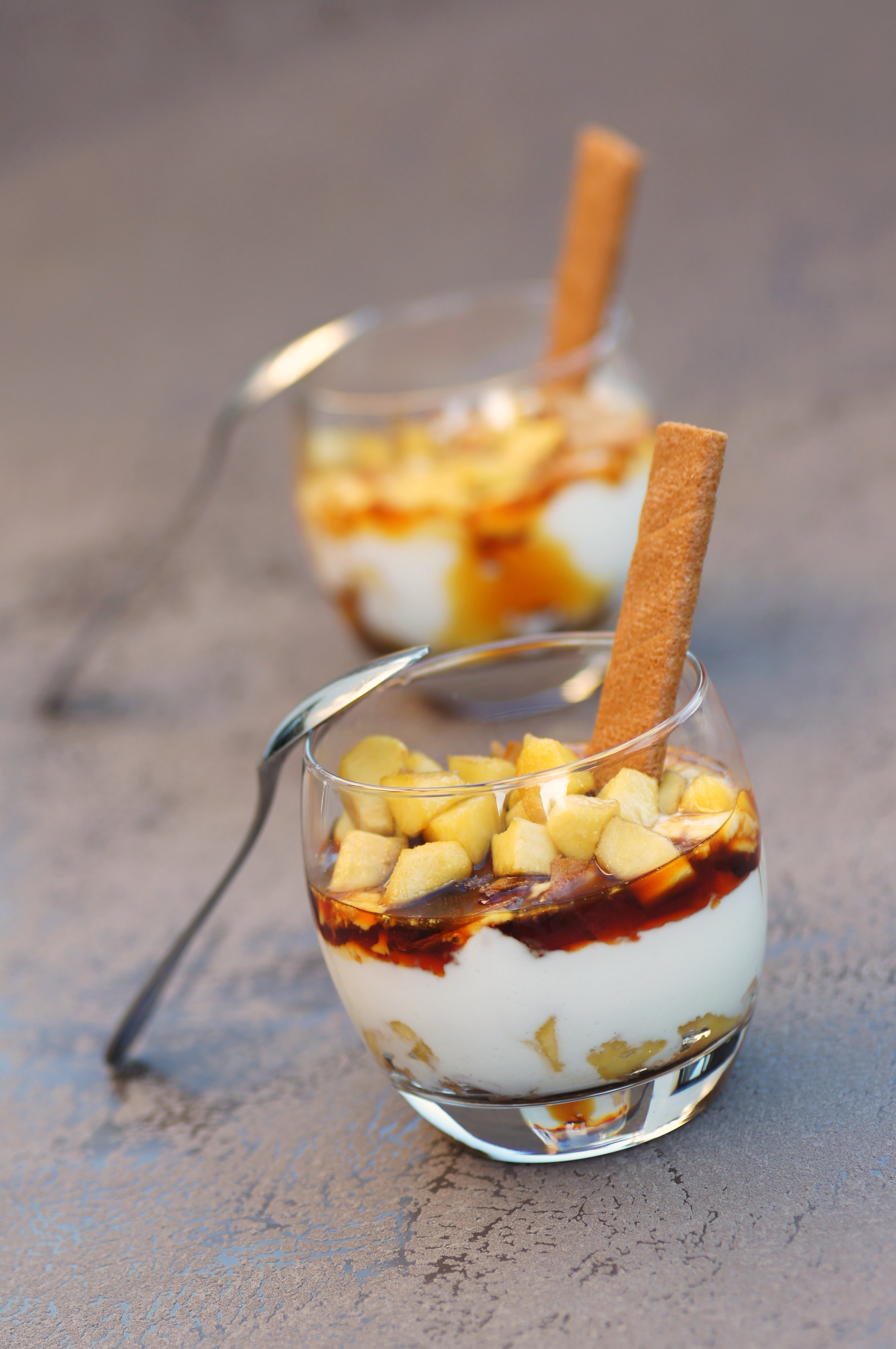 Mettre dans une verrine un fond de pommes, puis de la crème épaisse, une couche de pommes, napper de caramel.