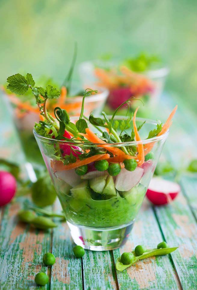 Dans des verrines placer un fond de petits pois mixés, ajouter les légumes, décorer de menthe et de persil.